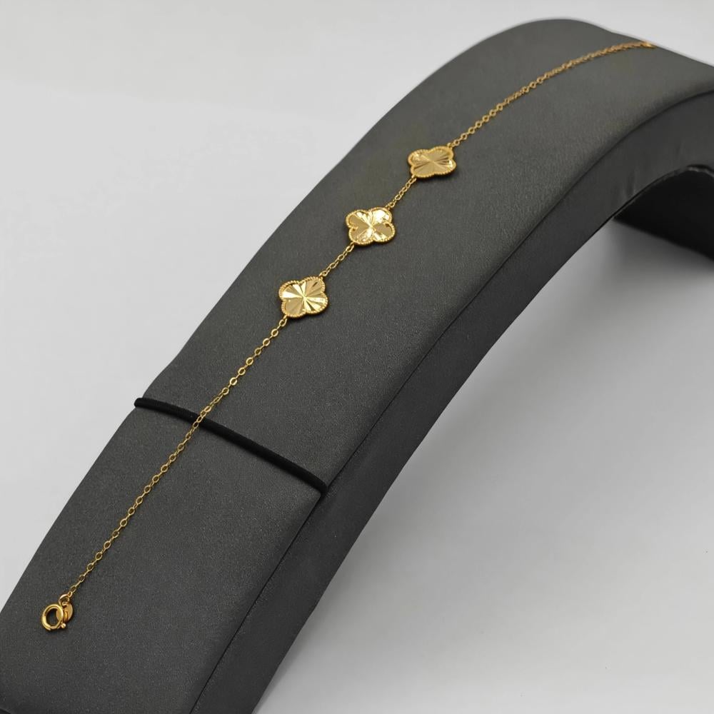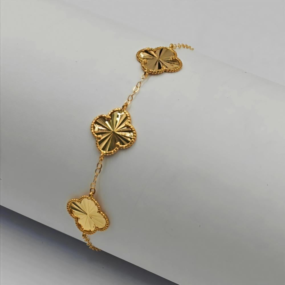 - أسوارة ذهب عيار 21 بتصميم فان كليف، وزن 1.25 جم، مقاس 7.5، تعليقة وردة ناعمة، أنيقة وخفيفة، مثالية للهدايا اليومية: 21K gold bracelet, Van Cleef design, approx. 1.25g, size 7.5, delicate floral charm, elegant and lightweight—perfect for daily gifting.