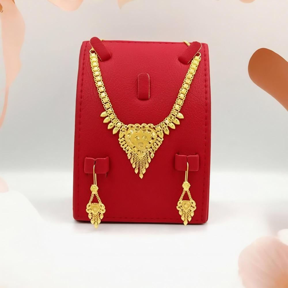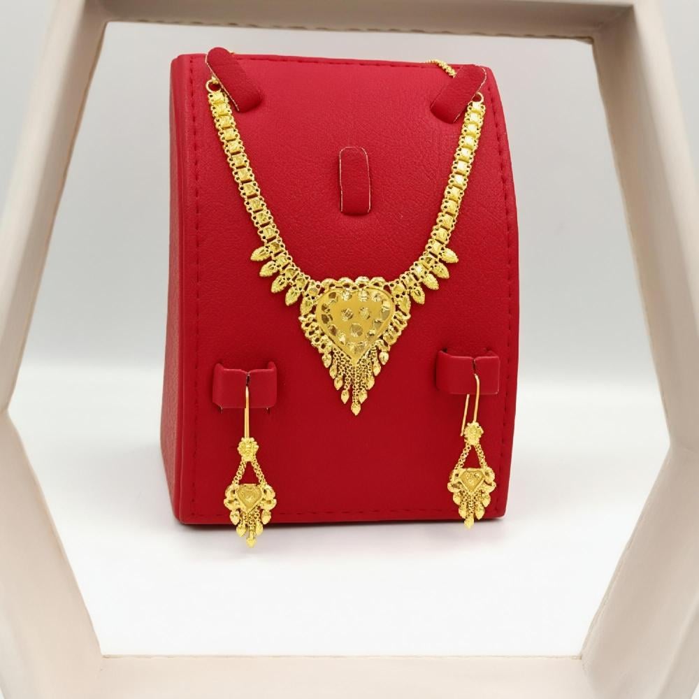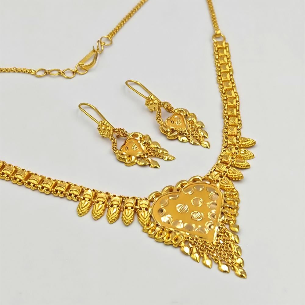 A 22K gold set typically includes matching pieces like earrings, necklaces, and bangles, all crafted from high-purity gold (91.6%). These sets are designed to complement each other, creating a cohesive and elegant look. Ideal for special occasions or weddings, they add a touch of luxury and sophistication to any outfit. With intricate designs and craftsmanship, a 22K gold set is a cherished addition to any jewelry collection, showcasing both beauty and lasting value.